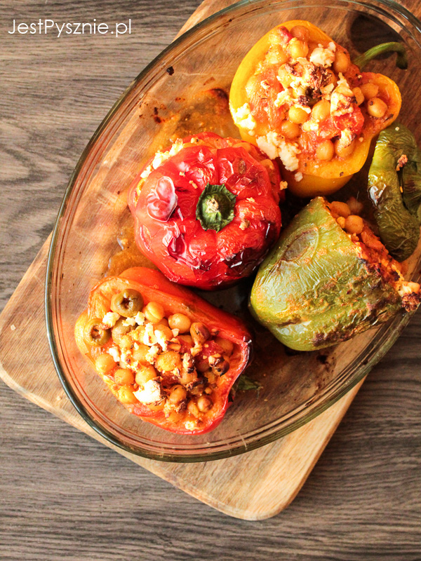Inspirowana kuchnią śródziemnomorską, kolorowa papryka faszerowana ciecierzycą z pomidorami, oliwkami i serem…