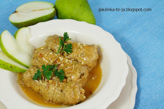 Delikatne roladki ze schabu z gruszką i camembertem w sosie własnym. Mięso…