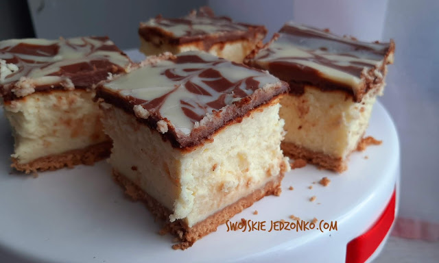 Sernik to moje ulubione ciasto,uwielbiam je w każdej postaci i często piekę różne rodzaje-ten przepis jest najlepszy jaki do tej pory jadłam.Cudownie kremowy i delikatny,dodałam polewę z mlecznej i białej czekolady .Do tego na spodzie ma herbatniki,więc zaoszczędzimy sporo czasu bo nie trzeba jeszcze robić do niego kruchego ciasta-zakochałam się