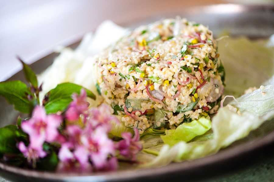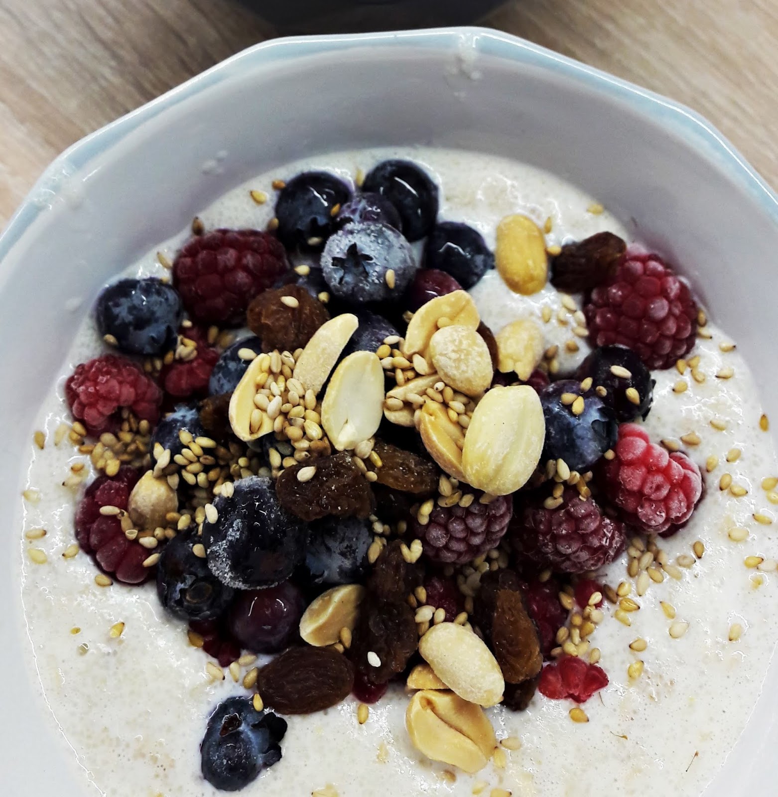 Składniki:2 szklanki mleka,6 łyżek płatków owsianych,4 łyżki kaszy manny orkiszowej,borówki amerykańskie,maliny,orzeszki ziemne,rodzynki,sezam.