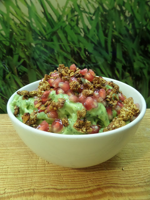lody banan-kiwi-jarmuż-limonka, podane z domową granolą i granatem Miałam wrócić, ale jakoś…