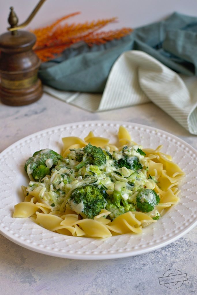 Makaron w sosie cukiniowo-serowym z dodatkiem ugotowanych różyczek brokuła. Bardzo smaczny.
