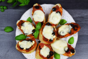 Zapiekana bagietka z mozzarellą, pesto, oliwkami, pomidorami