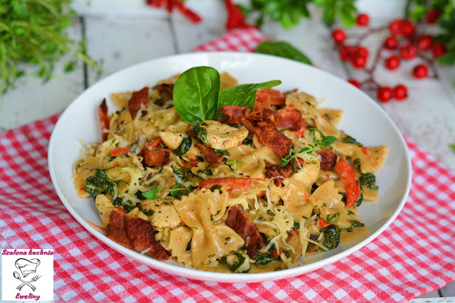 Soczyste, miękkie kawałki kurczaka marynowane w tymianku, podane z pełnoziarnistym makaronem, pieczarkami, czerwoną papryką i świeżym szpinakiem, a do tego sos z czosnkowym akcentem i chrupiący wędzony boczek to świetny pomysł na aromatyczny, pełnowartościowy obiad.