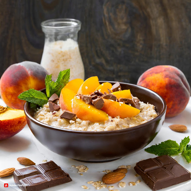 Owsianka z brzoskwiniami w syropie, migdałami i czekoladą / Oatmeal with peaches in syrup, almonds and chocolate