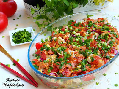 Sałatka z sałatą lodową, pomidorami i czerwoną cebulą, z dodatkiem chrupiącego boczku…