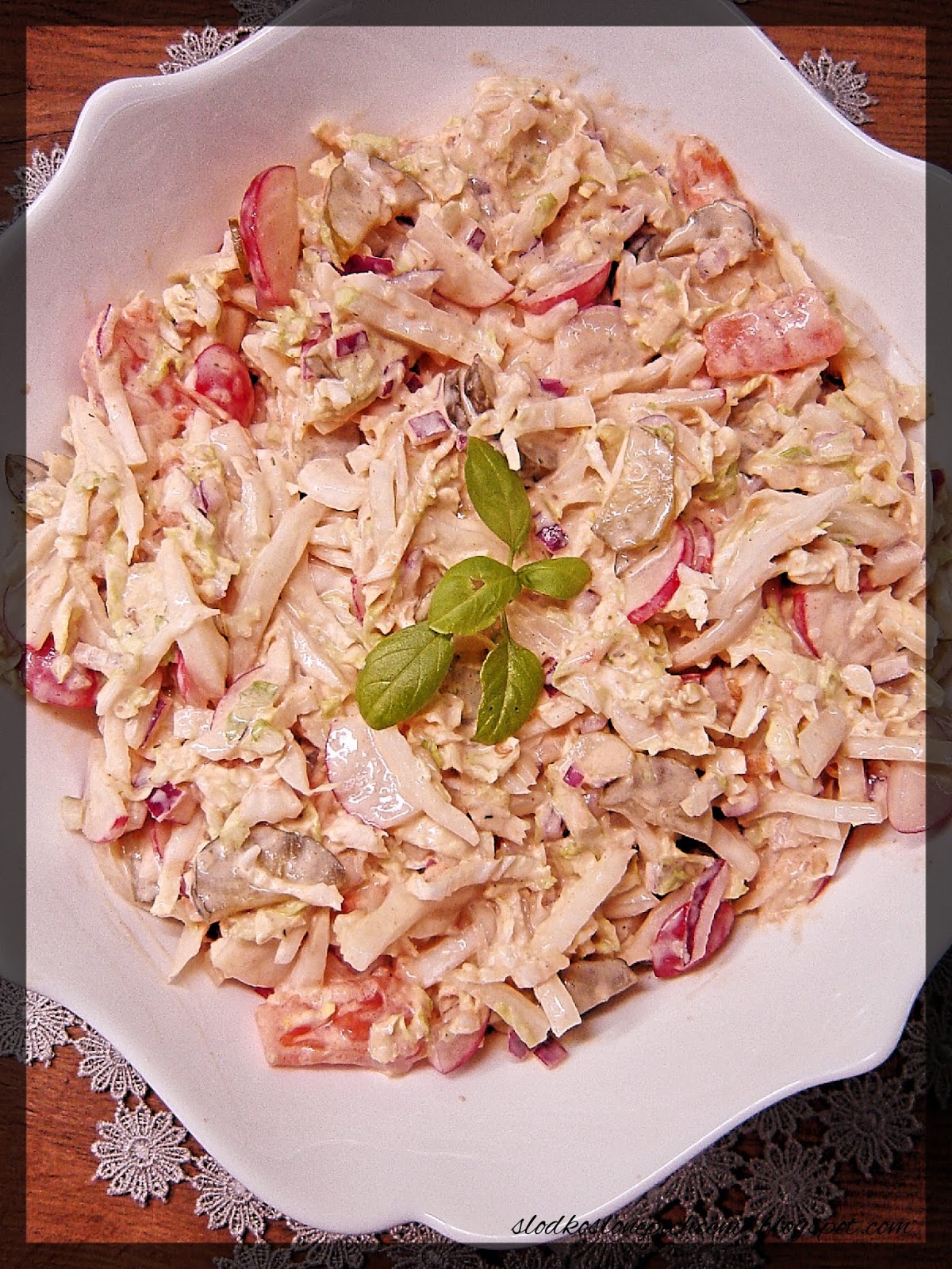 Surówka z kapusty pekińskiej z pomidorem, ogórkiem kiszonym, czerwoną cebulą i rzodkiewką z dodatkiem pysznego sosu i przyprawy gyros to doskonały dodatek do obiadu.