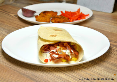 Nie tak dawno mieliśmy meksykański tydzień i codziennie na obiad jedliśmy burrito i inne dania z wykorzystaniem tortilli. Po krótkiej przerwie znów wracamy do dań z tortilli. Tym razem w towarzystwie panierowanych kawałków kurczaka oraz chrupiących plastrów bekonu. Wiem, że kaloryczne, ale za to