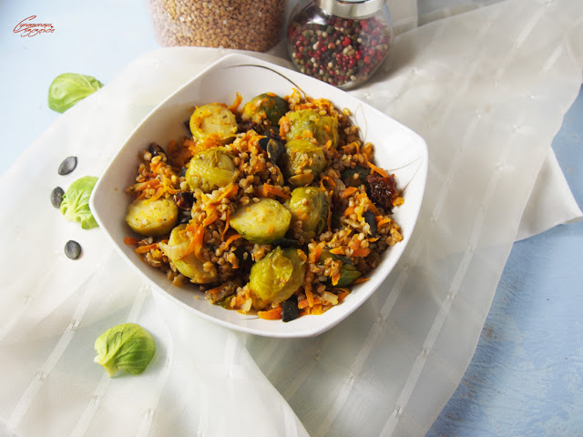 1 średniej wielkości cebula2-3 ząbki czosnku2 marchewki3/4 szklanki kaszy gryczanejok 20 brukselek50 g suszonych pomidorów (u mnie od Skworcu)3-4 łyżki pestek dynisól, pieprz,