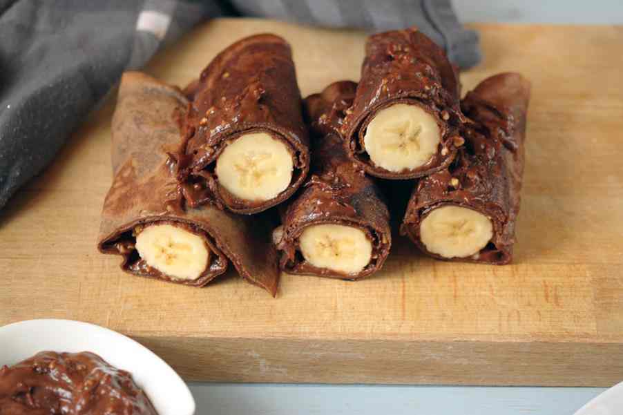 Czekoladowe naleśniki z bananem. Cienkie, delikatne naleśniki o smaku czekolady, wypełnione bananem i kremem czekoladowym. Te czekoladowe naleśniki z bananem są naszą nową wymówką aby cieszyć się czekoladą na śniadanie. Dekadenckie śniadanie na weekend. Naleśniki z domowym kremem