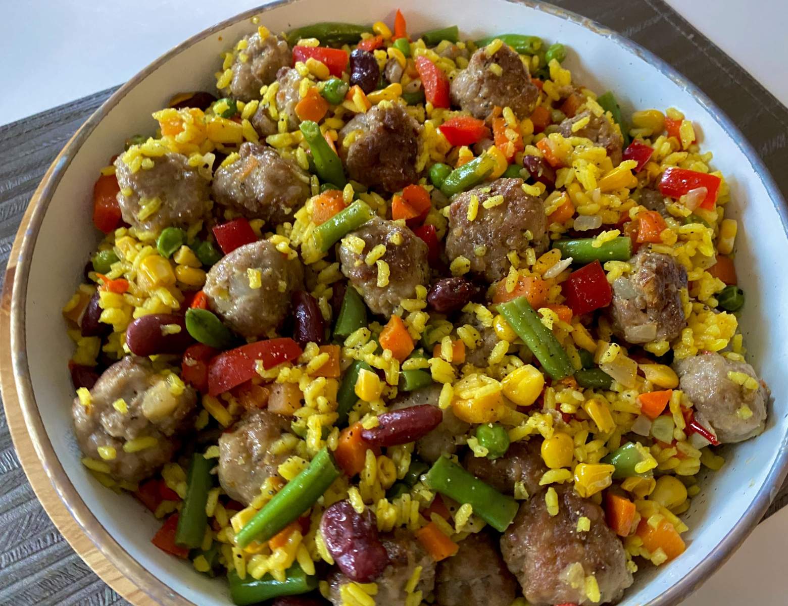 Przepyszne i bardzo szybkie danie jednogarnkowe z klopsikami wieprzowymi, ryżem i dużą ilością kolorowych warzyw. Super pomysł na sycący obiad dla całej rodziny. Polecam!