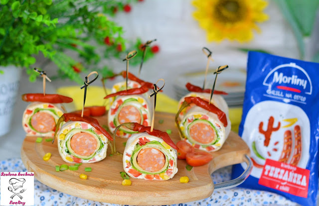 Tortilla z serkiem śmietankowym z dużą ilością pikantnej teksańskiej kiełbasy, plastrów żółtego…