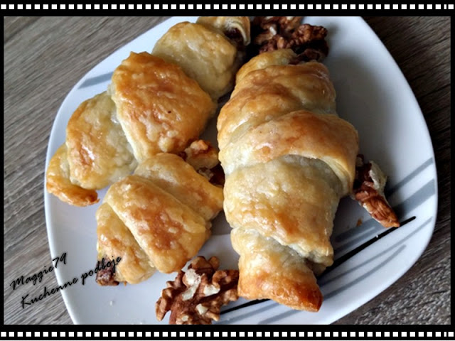 Składniki1 opakowanie ciasta francuskiego1 mozzarella(125g)1 łyżka cukru5 łyżek siekanych orzechów włoskich 1…