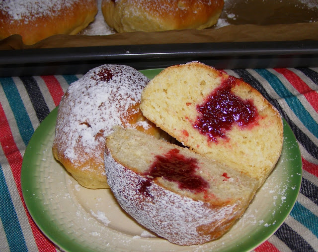 drożdże świeże 5 dag, mleko letnie 1,5 szklanki, cukier 3/4 szklanki, żółtka 6 sztuk „M”, sól 1 szczypta, esencja waniliowa 1 łyżeczka, masło stopione 100 gram, mąka tortowa 50-60 dag, dżem borówka leśna 300 gram, cukier puder – ile potrzeba