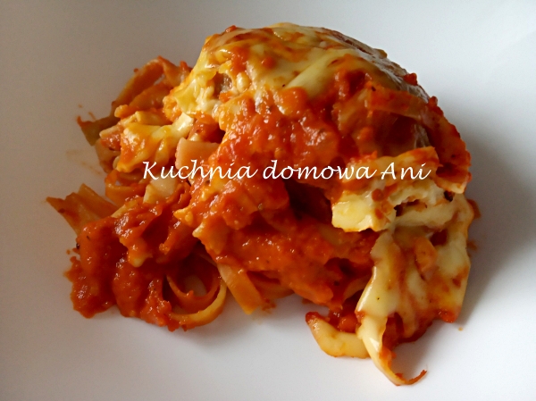 Polecam Wam na obiad pyszny makaron zapiekany z mięsem mielonym oraz sosem pomidorowym. Danie bardzo syte, więc takie jednogarnkowe 😉