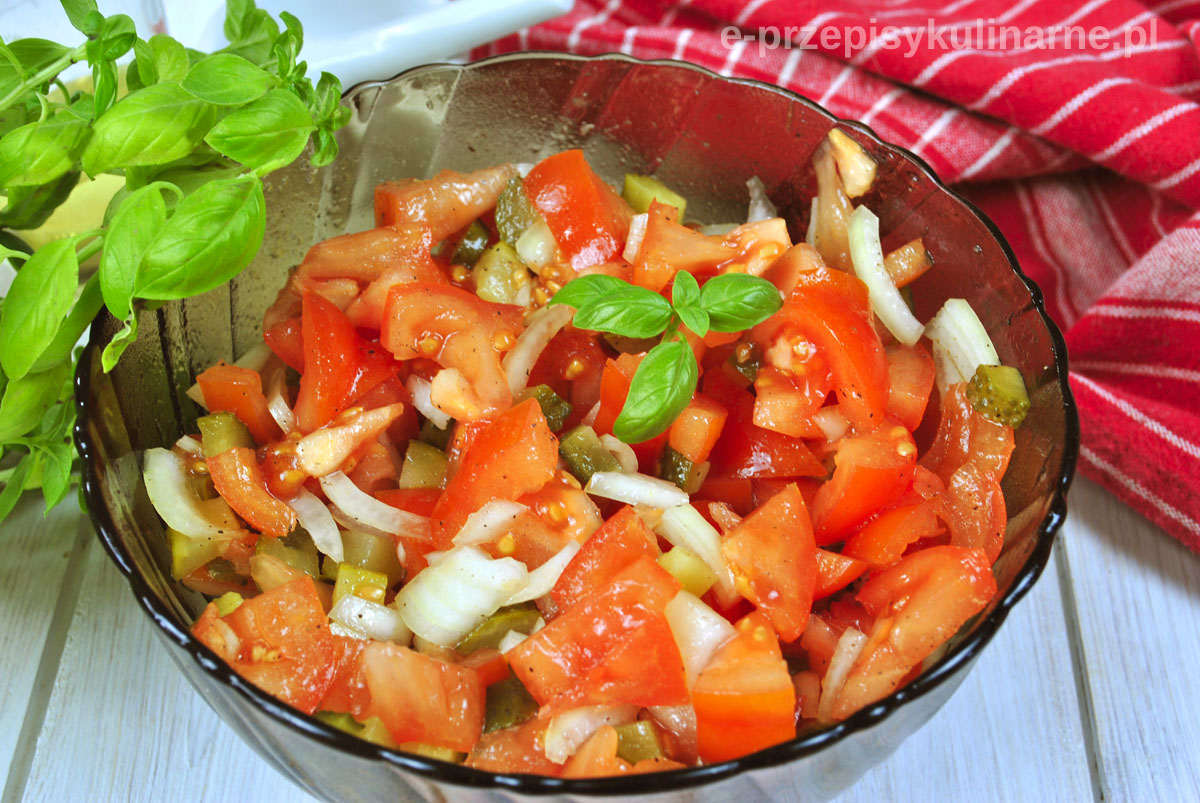 Surówka z pomidorów i ogórków konserwowych jest idealnym dodatkiem do obiadu, pieczonego mięsa czy burgerów. Robi się ją błyskawicznie i nie wymaga wiele pracy. To klasyczne połączenie pomidorów, ogórków i cebuli zasmakuje każdemu. Zimą do surówki używam ogórków konserwowych, gdyż ciężko znaleźć świeże, które byłyby smaczne, ale latem