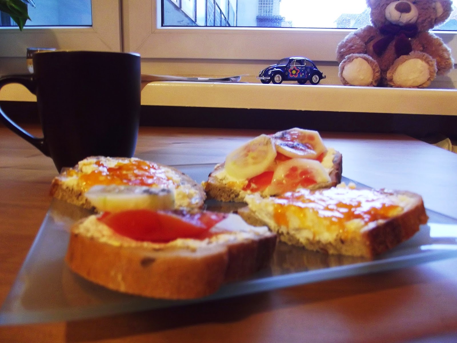 chleb pełnoziarnisty z twarogiem (półtłustym) i dżemem dyniowym oraz z ogórkiem, pomidorem,…