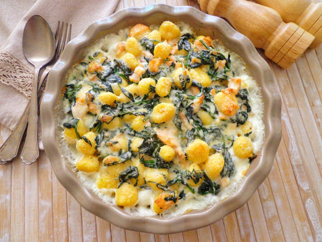 Jeżeli pozostały Wam kopytka lub gnocchi z obiadu, możecie wykorzystać je do przygotowania dzisiejszej zapiekanki. Ugotowane kluseczki z kremowym sosem beszamelowym z dodatkiem szpinaku i wędzonego łososia po upieczeniu stają się wyśmienitą zapiekanką, która powinna zachwycić niejednego smakosza.