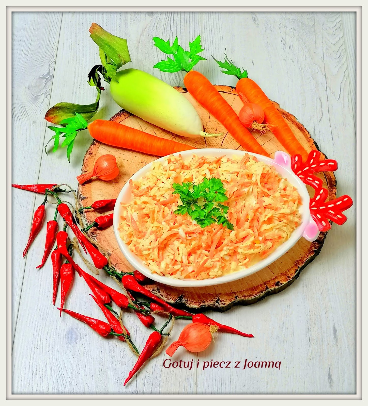 Dzień dobry 🙂 Dzisiaj mam dla Was propozycję szybkiej i pysznej surówki z marchewki, białej rzodkwi i jajka.Idealny dodatek do mięs i ryb.