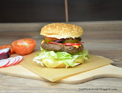 Domowy, prawdziwy hamburger z kotletem z czystej wołowiny. Chciałam niczym niezakłócony smak szlachetnej wołowiny, dlatego do mięsa nie dodawałam, ani cebuli, ani jajka. Tylko sól i pieprz. Mięso wyszło bardzo kruche i delikatne.