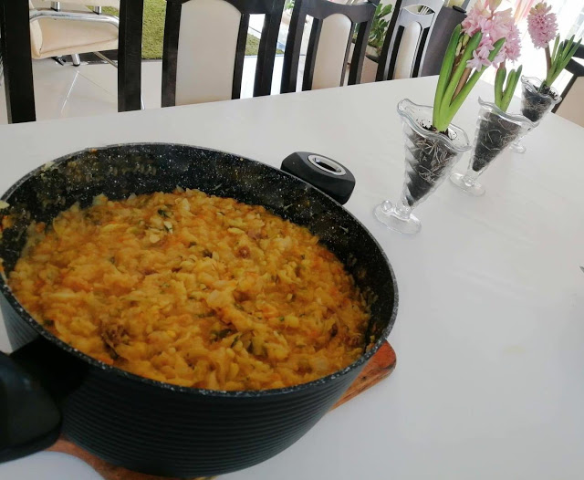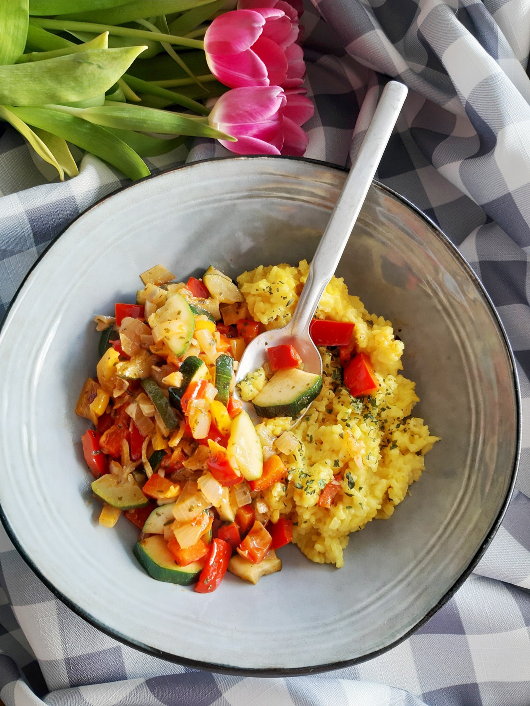 Propozycja na aromatyczne warzywa z kremowym, maślanym ryżem z dodatkiem grana padano i kurkumy. Idealny obiad w tygodniu lub szybki posiłek w weekend. Na talerzu jest zdrowo, kolorowo, kusząco dzięki unoszącym się w kuchni aromatom. Polecam maślano-serowy ryż z papryką i cukinią, danie które podasz z makaronem wszelakim, natką i
