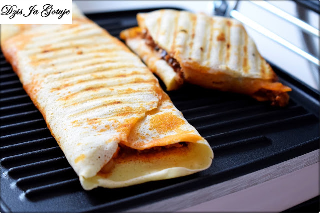 Naleśniki zapiekane z mięsem mielonym, ciasto jest pyszne i chrupiące.
