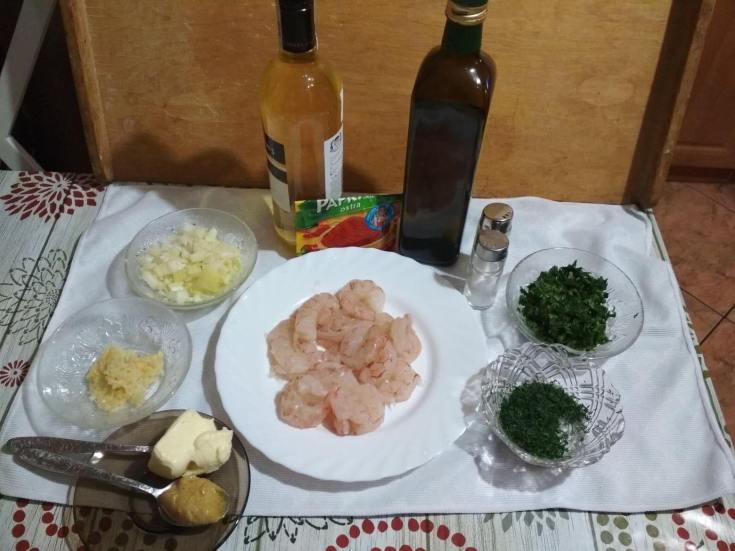270 gram krewetek argentyńskich1 średnia cebula4-5 ząbków czosnku1 pęczek świeżego koperku1 pęczek świeżej natki pietruszki1 czubata łyżka masła1 łyżka musztardy100 ml białego wytrawnego wina1/3 szklanki