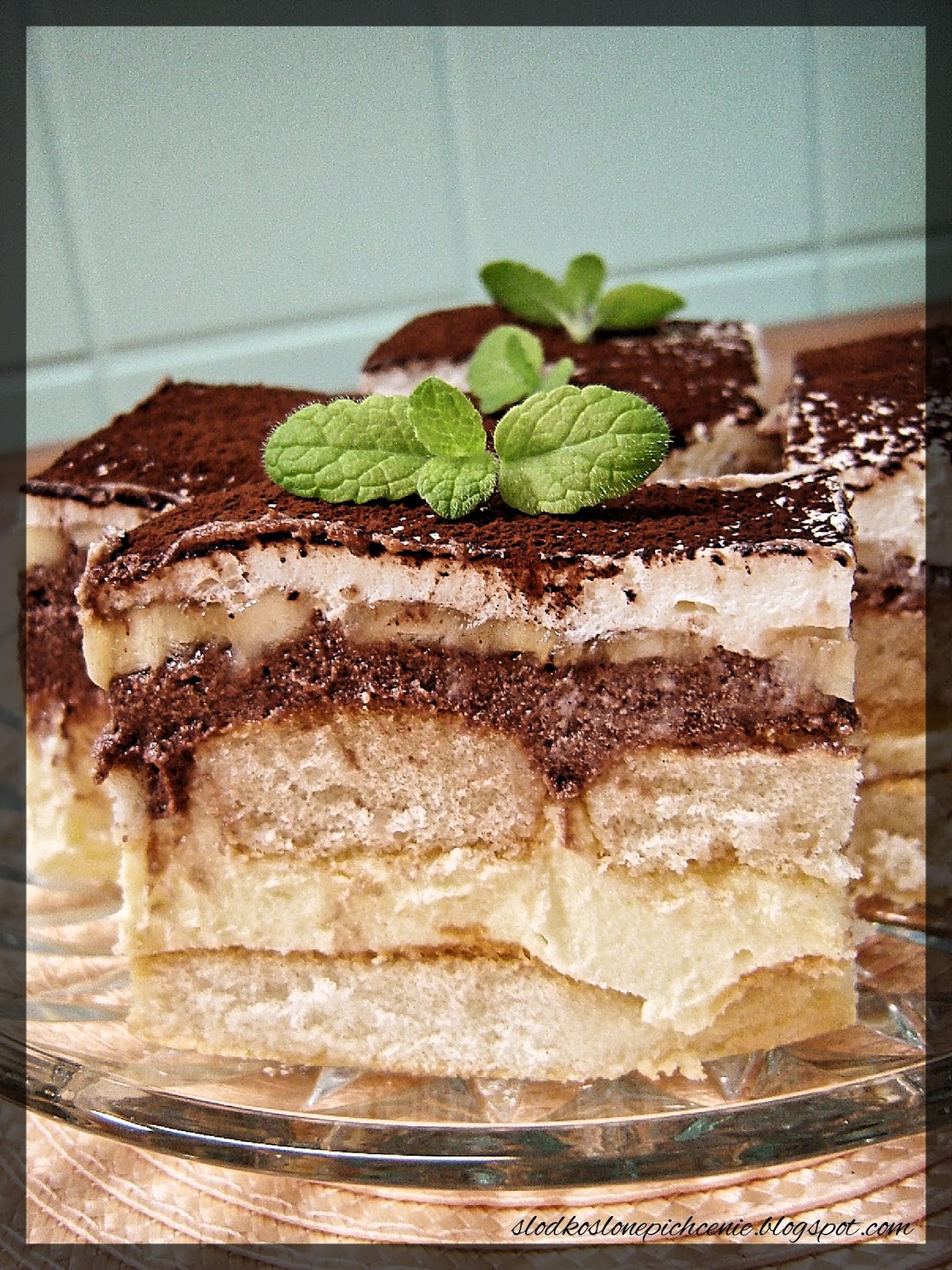 Przepyszne, rozpływające się w ustach ciasto bez pieczenia na biszkoptach z kremem budyniowym waniliowym i kakaowym, bananami oraz lekko rumowym posmakiem.