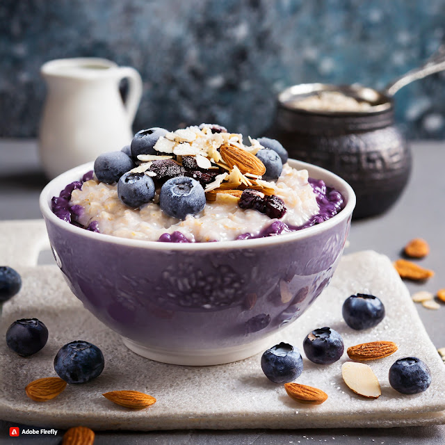 Owsianka z mrożonymi jagodami, rodzynkami i płatkami migdałów / Oatmeal with frozen bluberries, rasins and almond flakes