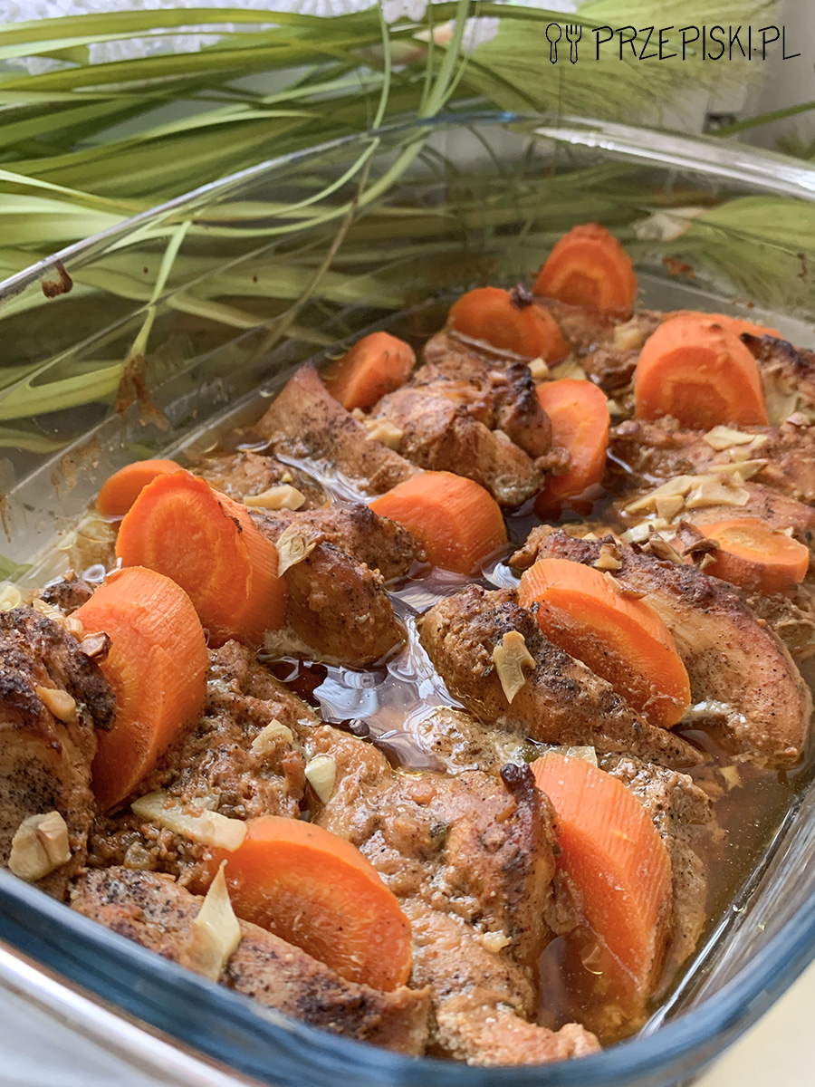 Filet z kurczaka zapiekany w naczyniu żaroodpornym z marchewką i czosnkiem to…