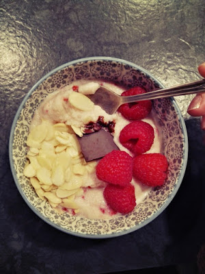 banan + seler naciowy + płatki jaglane + młody jęczmień + mleko sojowe