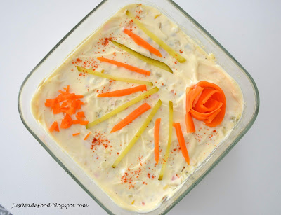 Przepis na tą sałatkę jarzynową wyszedł przypadkowo, ponieważ zapomniałam dodać jednego składnika i okazało się to być strzałem w dziesiątkę. Do tego trochę inne proporcje i wyszło rewelacyjnie.