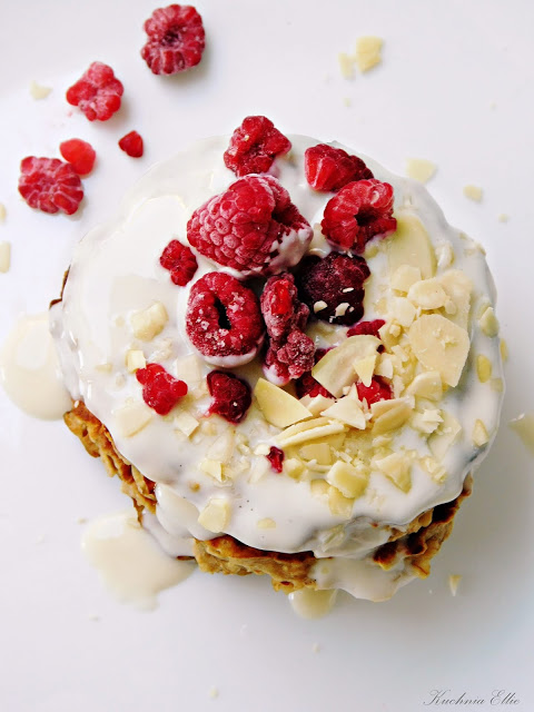 Pyszne i proste w przygotowaniu placuszki inspirowane amerykańskimi naleśnikami pancakes. Jeśli nie lubicie posmaku proszku do pieczenia czy sody, ubijcie białko do uzyskania piany i dopiero wtedy dodajcie resztę składników. Moja propozycja podania to sos z jogurtu i odżywki białkowej o smaku karmelowym, mrożone maliny i pokruszone płatki migdałowe.