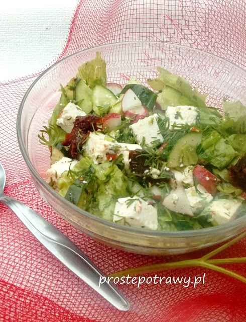 Przygotowanie :Umytą rzodkiewkę, ogórek i ser pokroić Sałatę porwać na kawałki, pomidory