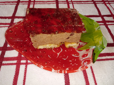 500 g sera białego3/4 szklanki cukru3 łyżki250 g margaryny200 g gorzkiej czekolady200 ml mleka2 opakowania galaretki o smaku truskawkowym700 ml gorącej wody1 paczka okrągłych biszkoptów (ok. 180g)50 g startej gorzkiej czekolady Przygotowanie: