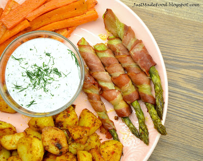 Sezon na szparagi w pełni trwa. Mój szparagowy tydzień rozpoczynam od pieczonych szparagów, zawiniętych w cienkie plastry boczku. Szparagi podałam w towarzystwie pieczonej marchewki, oraz pieczonych młodych ziemniaków, a także prostego sosu śmietanowo-koperkowego.