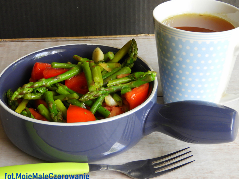 To pyszna sałatka, którą robi się błyskawicznie ale jest warunek: szparagi muszą być jędrne i świeże, tak samo jak i pomidory.