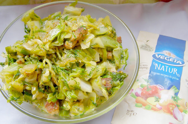 boczek świeży surowy bez kości 30 dag, cebula 1 sztuka, VEGETA NATUR mieszanka warzywna do potraw „zobacz TUTAJ” 2 szczypty, kapusta młoda 2 główki, VEGETA NATUR mieszanka warzywna do potraw „zobacz TUTAJ” 1,5 łyżeczki, pieprz mielony 1/2 łyżeczki, mąka pszenna 1 łyżka, koperek 1