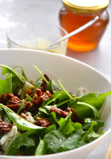 Błyskawiczna sałatka, którą wykorzystałam ostatnio jako dodatek do grilla.Składniki:Rukola- 2, 3 spore garściPomidory suszone z zalewy- ok 8 sztuk- siekamy100g sera koziego- kroimy dowolnieGarstka orzechów włoskich- w całości