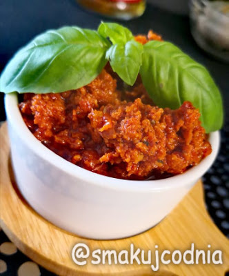 Czerwone pesto to jeden z moich ulubionych włoskich sosów. Dodaję go do kanapek, makaronów, sałatek. Wymaga niewielu składników a czas jego wykonania to jakieś kilka minut. Zdecydowanie wolę zrobić je sama niż kupić w sklepie. Dzięki temu wiem co jem i jakich dodatków używam 🙂 Pamiętajcie, że podstawą są tu