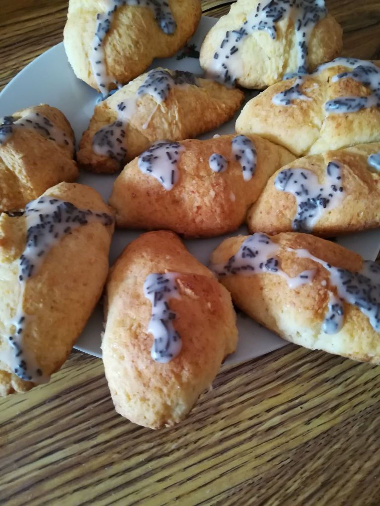 Rogaliki serowe z brzoskwiniami ,jabłkami i gruszkami .