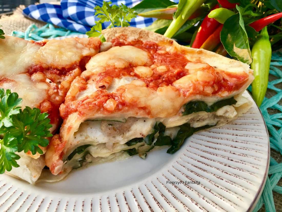 Lazania z tortilli z kurczakiem gyros i szpinakiem