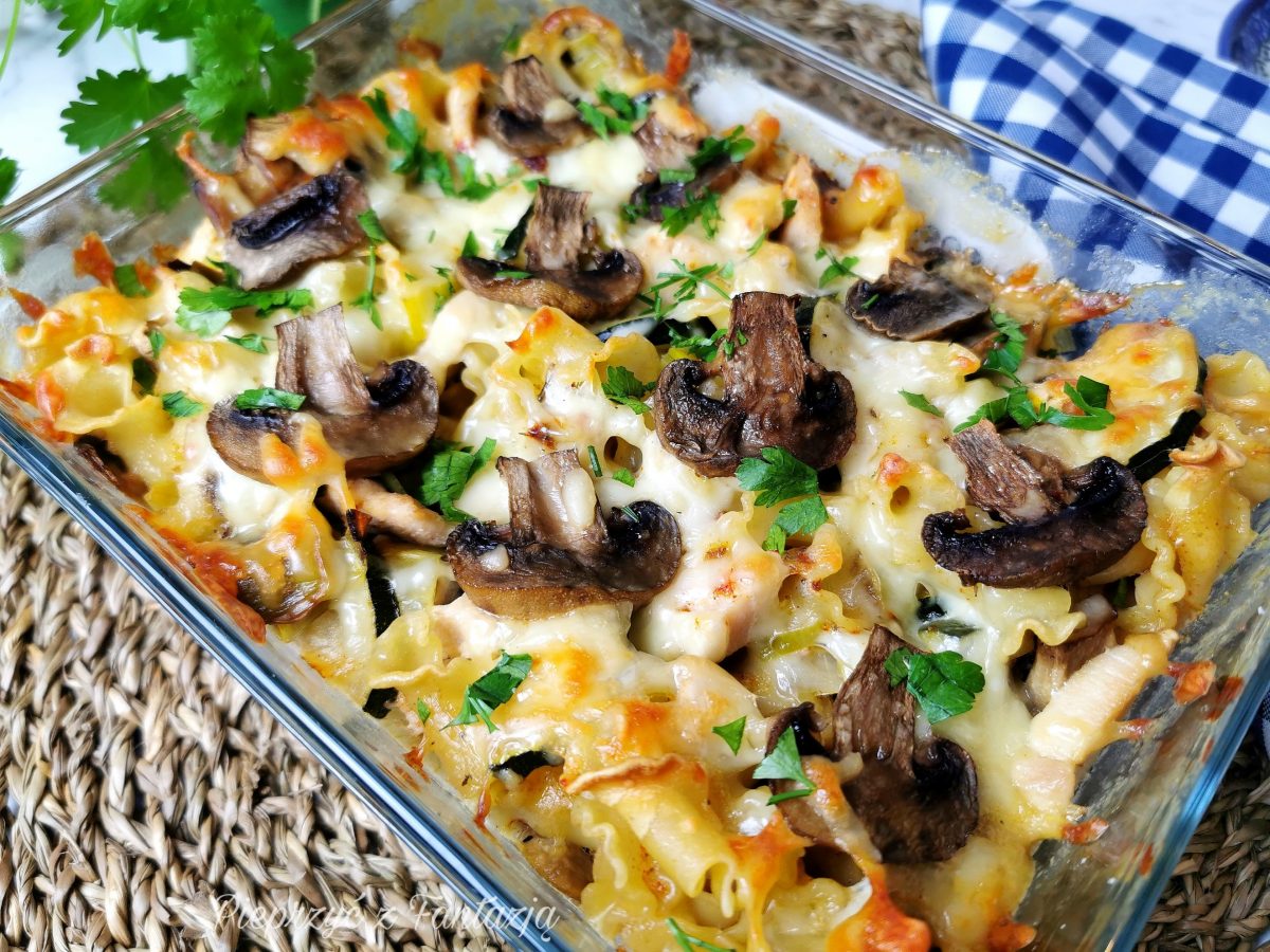 Zapiekanka makaronowa z kurczakiem i pieczarkami to bardzo proste i bardzo smaczne danie. Pomijając to, ze trzeba najpierw ugotować makaron a następnie usmażyć mięso i pieczarki można je nazwać daniem jednogarnkowym. W sumie podczas zapiekania patelnię i garnek zdążymy umyć 😉 Możecie śmiało robić taki obiadek, posmakuje dzieciom i seniorom,