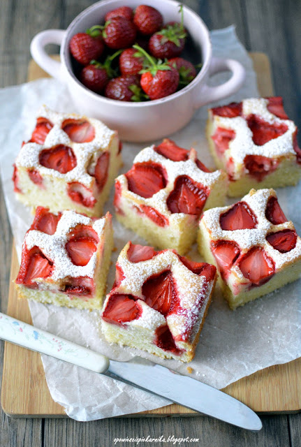 Puszyste, lekkie, a do tego proste – zarówno pod względem wykonania jak i składników – ciasto z truskawkami. Pieczone z dodatkiem oleju, dzięki czemu jest niezwykle wilgotne i długo zachowuje świeżość. A w smaku? Jak dla mnie poezja :). Niby proste, z łatwo dostępnych składników, ale to właśnie w