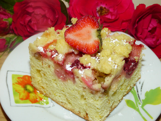 Pyszne ciacho ucierane z owocami sezonowymi i kruszonką. Mój mąż to ciasto uwielbia.