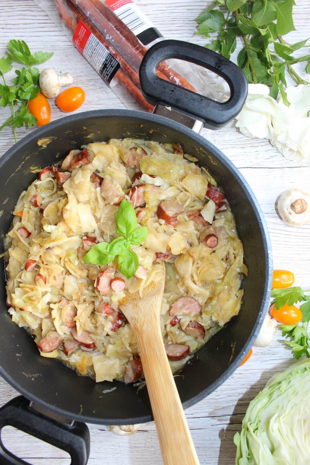 Łazanki z młodą i kiszoną kapustą Dziś zapraszam Was na prosty i pyszny przepis na obiad. Łazanki. Klasyka, tym razem w wersji z młodą kapustą, kiszoną kapustą, pieczarkami, boczkiem, kiełbasą i pysznymi kabanosami. Dla nas połączenie idealne. Pysznie, prosto i naprawdę sycąco. Obiad dla całej rodziny. Koniecznie