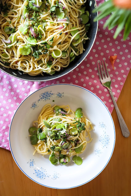 500g bobu3 ząbki czosnku1/2 dużej czerwonej cebuli lub 1 mniejsza5 łyżek oliwypęczek pietruszki300g spaghettisól + pieprz