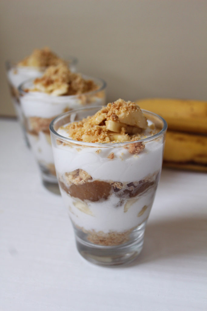Wersja deseru Banoffee z ubitym mleczkiem kokosowym, zamiast bitej śmietany. Karmel przygotowałam…