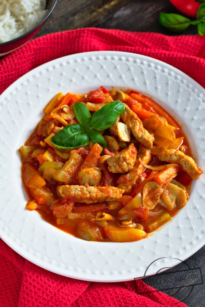 Papryka w towarzystwie pomidorów to zdecydowanie jedno z moich ulubionych połączeń smakowych. Z tego też powodu już przed przygotowaniem tego dania wiedziałam, że będzie mi ono smakować (nawet pomimo tego, że fanką samego schabu nie jestem i nigdy nie byłam;) ).