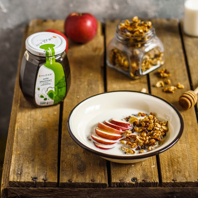Sezon jabłkowy powolutku się zaczyna dlatego przychodzę do Was z nową, pyszną, jabłkową propozycją czyli przepisem na granolę jabłkową! Pachnącą cynamonem, słodką od miodu i bardzo chrupiącą. Granola jabłkowa świetnie sprawdzi się do mleka, jogurtu lub sama do pochrupania podczas oglądania filmu lub serialu. Śmiało możecie pakować ją również